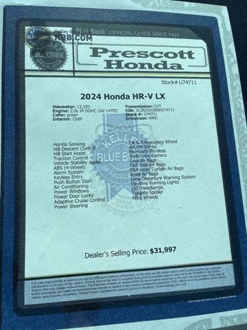 Located in Prescott AZ, and also serving Flagstaff, Cottonwood, Sedona, Camp Verde, Scottsdale, and the greater Phoenix area. Also, we're part of the Valley Honda Dealers. Thank you again for your interest in this Honda HR-V. It is equipped with these features: 4 Speakers, 4-Wheel Disc Brakes, 5.436 Axle Ratio, ABS brakes, Adaptive Cruise Control: Adaptive Cruise Control (ACC) with Low-Speed Follow, Air Conditioning, Alloy wheels, AM/FM radio, Apple CarPlay/Android Auto, Auto High-beam Headlights, Automatic temperature control, Brake assist, Bumpers: body-color, Cloth Seat Trim, Delay-off headlights, Driver door bin, Driver vanity mirror, Dual front impact airbags, Dual front side impact airbags, Electronic Stability Control, Emergency communication system: HondaLink, Exterior Parking Camera Rear, Four wheel independent suspension, Front anti-roll bar, Front Bucket Seats, Front Center Armrest, Front reading lights, Fully automatic headlights, Illuminated entry, Knee airbag, Low tire pressure warning, Occupant sensing airbag, Outside temperature display, Overhead airbag, Panic alarm, Passenger door bin, Passenger vanity mirror, Power door mirrors, Power steering, Power windows, Radio data system, Radio: 180-Watt Audio System w/4 Speakers, Rear anti-roll bar, Rear reading lights, Rear side impact airbag, Rear window defroster, Rear window wiper, Remote keyless entry, Security system, Speed control, Speed-sensing steering, Split folding rear seat, Spoiler, Steering wheel mounted audio controls, Tachometer, Telescoping steering wheel, Tilt steering wheel, Traction control, Trip computer, Variably intermittent wipers, and Wheels: 17" Silver Painted Alloy.